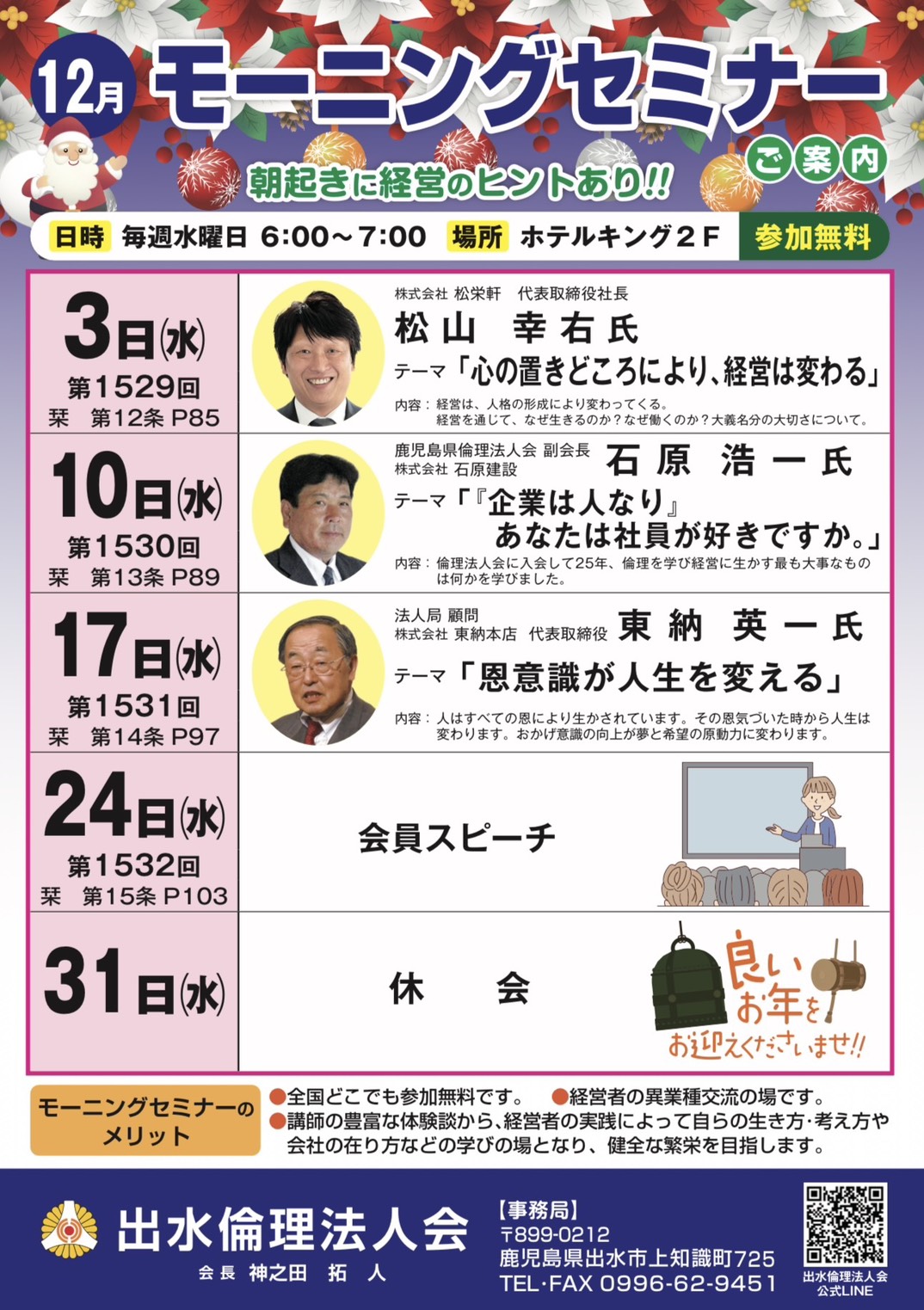 【出水】令和7年12月モーニングセミナースケジュール 2025年11月29日 最終更新日時 : 2025年11月29日 kagoshimarinri 出水倫理法人会の令和7年12月モーニングセミナースケジュールです。