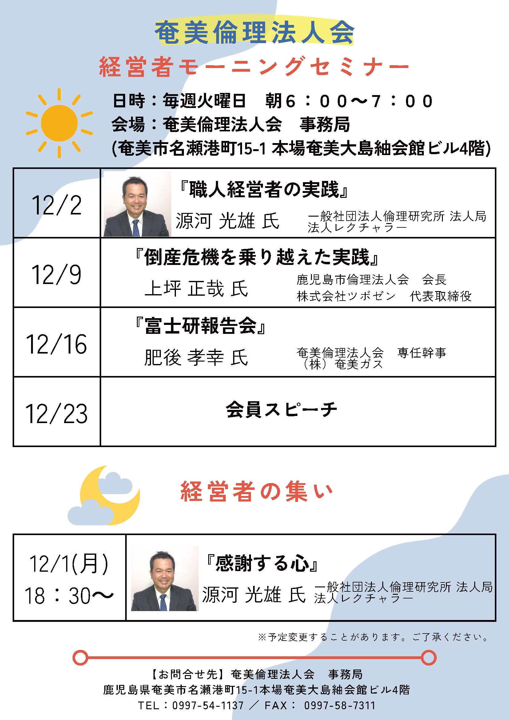 【奄美】令和7年12月モーニングセミナースケジュール 2025年11月29日 最終更新日時 : 2025年11月29日 kagoshimarinri 奄美倫理法人会の令和7年12月モーニングセミナースケジュールです。