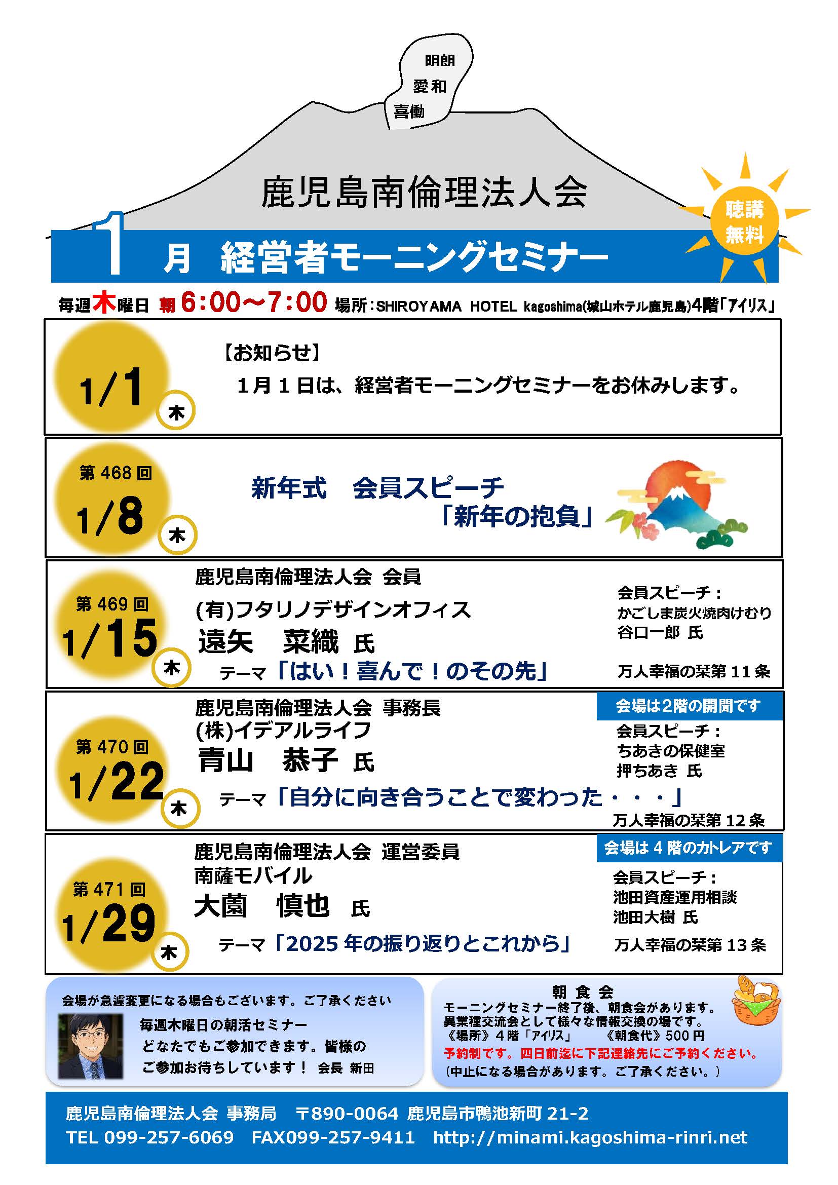 【鹿児島南】令和8年1月モーニングセミナースケジュール 2025年12月30日 最終更新日時 : 2025年12月30日 kagoshimarinri 鹿児島南倫理法人会の令和8年1月モーニングセミナースケジュールです。