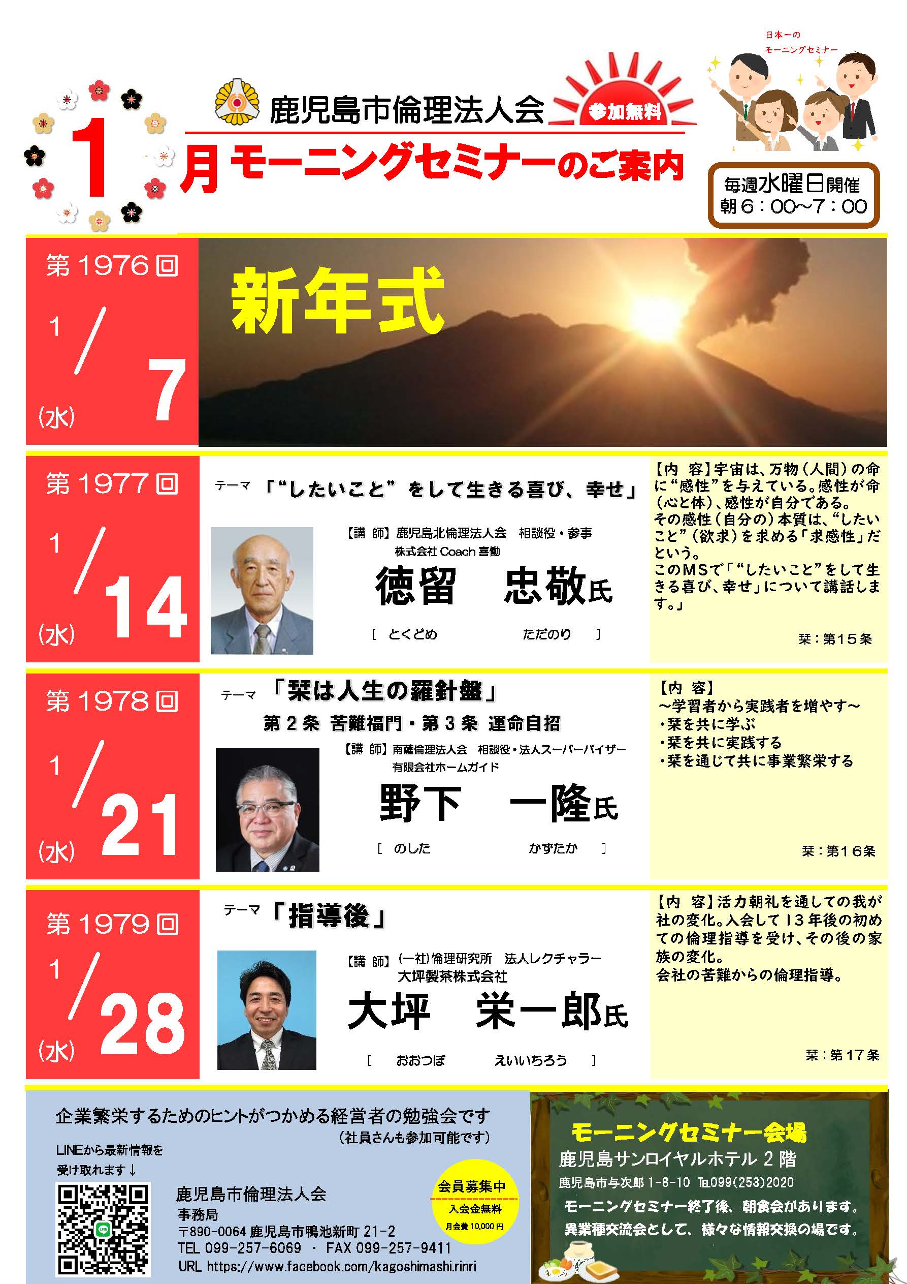 【鹿児島市】令和8年1月モーニングセミナースケジュール 2025年12月30日 最終更新日時 : 2025年12月30日 kagoshimarinri 鹿児島市倫理法人会の令和8年1月モーニングセミナースケジュールです。