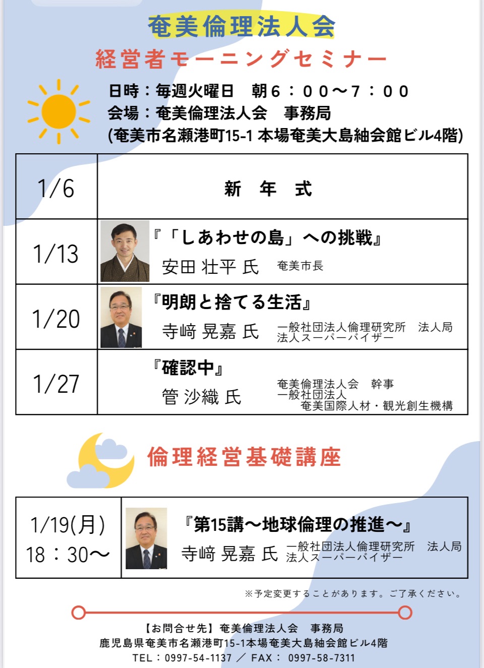 【奄美】令和8年1月モーニングセミナースケジュール 2025年12月30日 最終更新日時 : 2025年12月30日 kagoshimarinri 奄美倫理法人会の令和8年1月モーニングセミナースケジュールです。