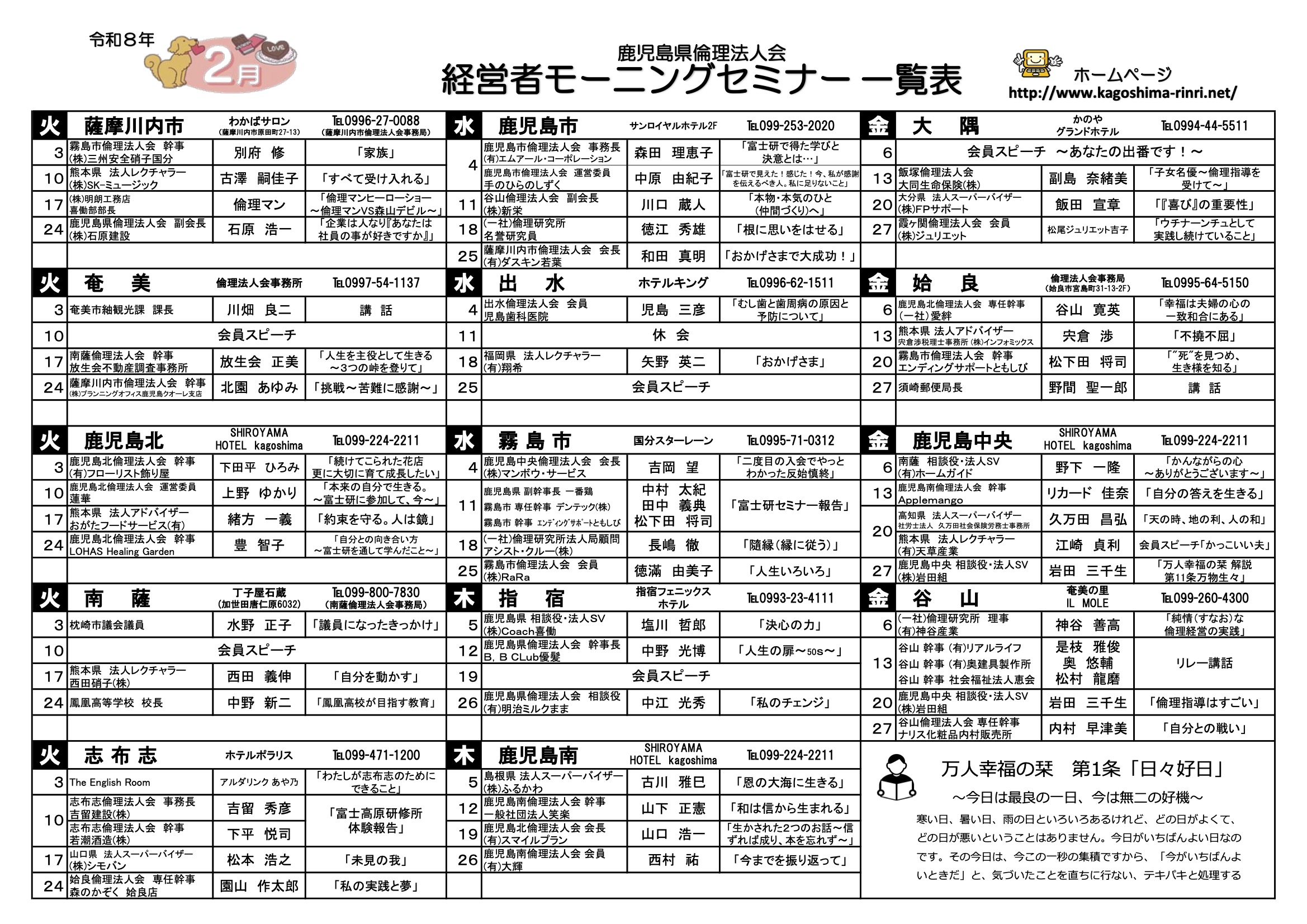 令和8年2月の鹿児島県内倫理法人会 全単会の経営者モーニングセミナー予定表 2026年1月28日 最終更新日時 : 2026年1月28日 kagoshimarinri 令和8年2月の鹿児島県内倫理法人会の経営者モーニングセミナー予定表を掲載しました PDFデータはこちら 令和8.2月MS一覧表今月のモーニングセミナー一覧表をダウンロード