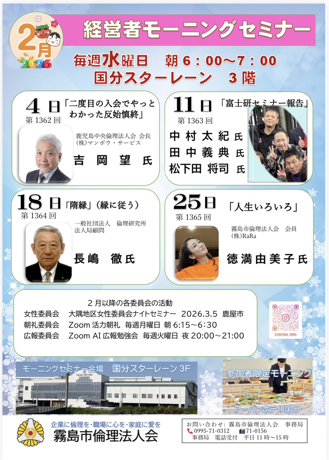 【霧島市】令和8年2月モーニングセミナースケジュール 2026年1月29日 最終更新日時 : 2026年1月29日 kagoshimarinri 霧島市倫理法人会の令和8年2月モーニングセミナースケジュールです。