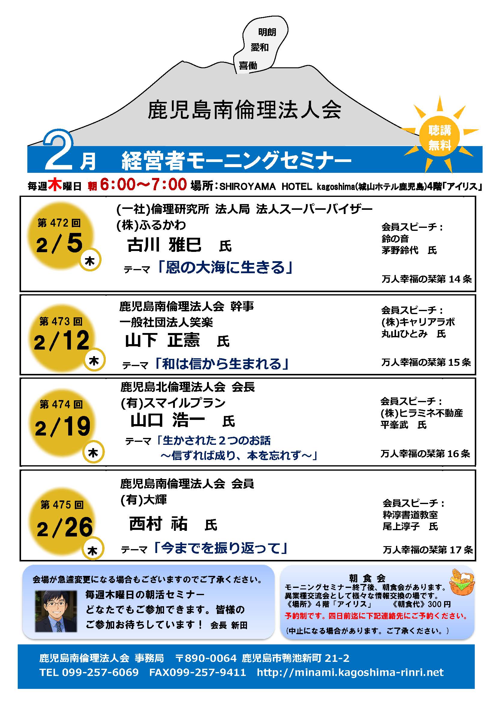 【鹿児島南】令和8年2月モーニングセミナースケジュール 2026年1月29日 最終更新日時 : 2026年1月29日 kagoshimarinri 鹿児島南倫理法人会の令和8年2月モーニングセミナースケジュールです。