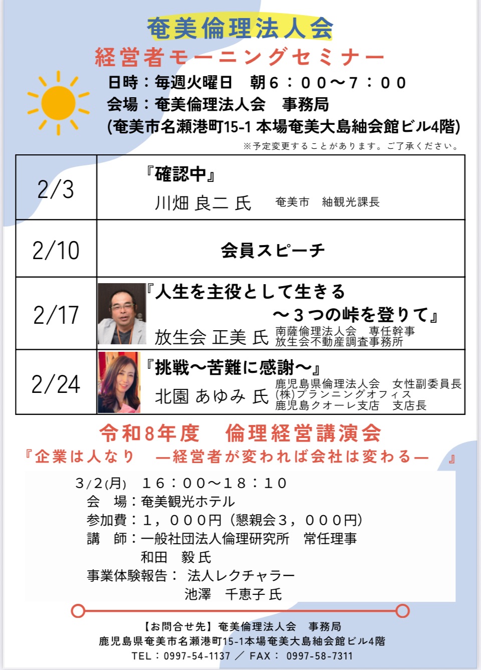【奄美】令和8年2月モーニングセミナースケジュール 2026年1月29日 最終更新日時 : 2026年1月29日 kagoshimarinri 奄美倫理法人会の令和8年2月モーニングセミナースケジュールです。
