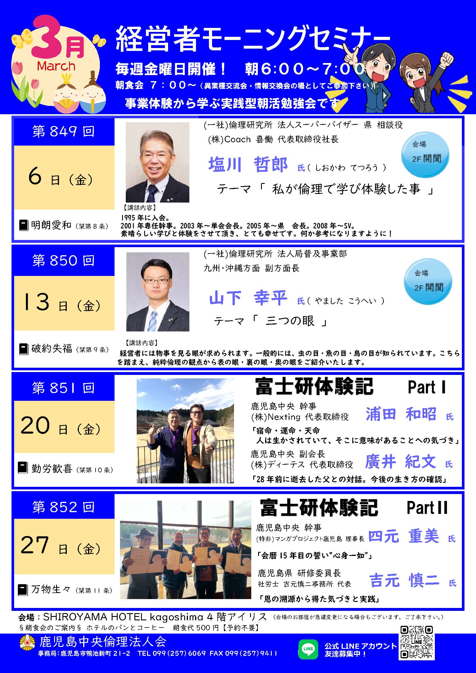 【鹿児島中央】令和8年3月モーニングセミナースケジュール 2026年2月25日 最終更新日時 : 2026年2月25日 kagoshimarinri 鹿児島中央倫理法人会の令和8年3月モーニングセミナースケジュールです。