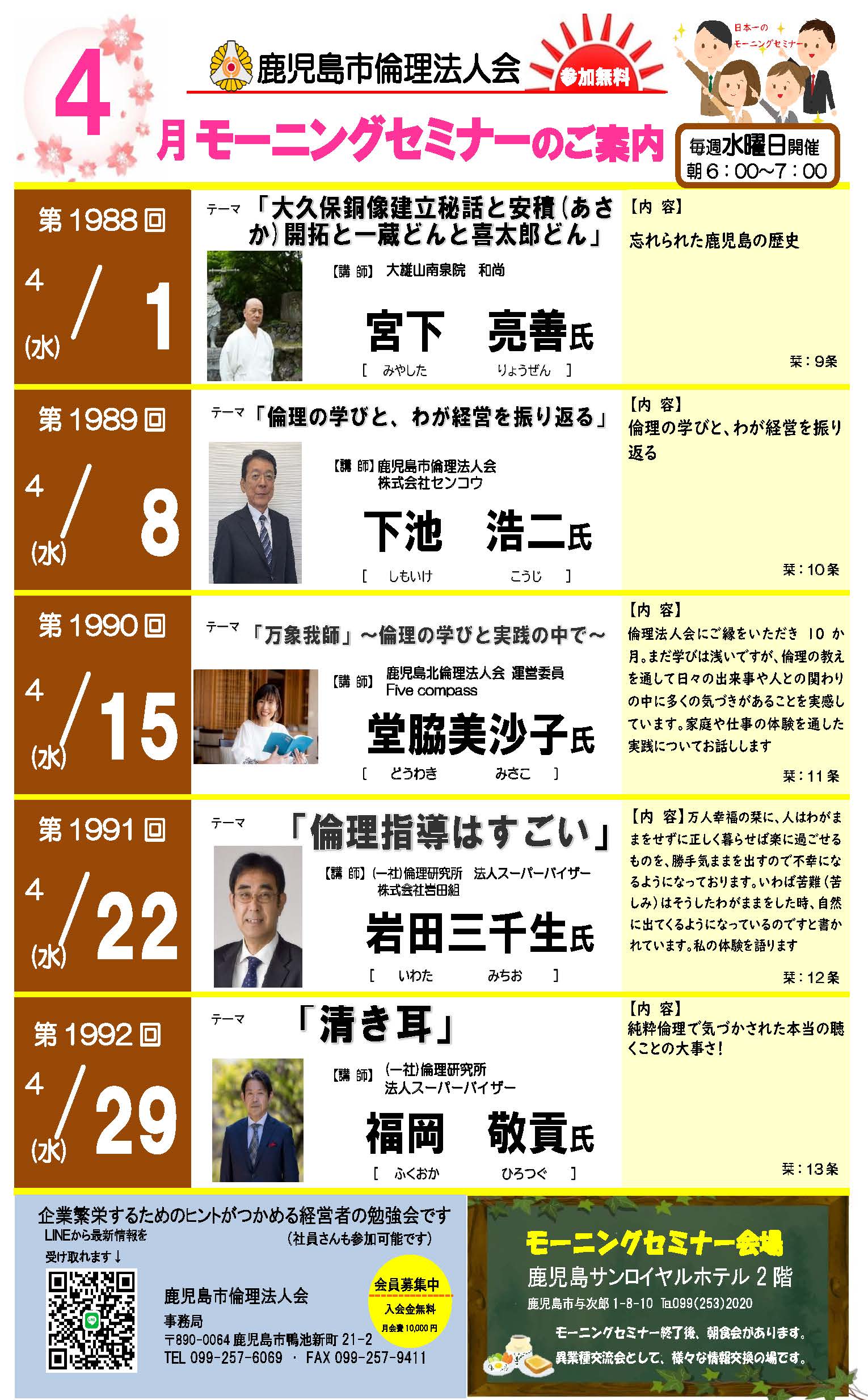 鹿児島市倫理法人会の令和8年4月モーニングセミナースケジュールです。